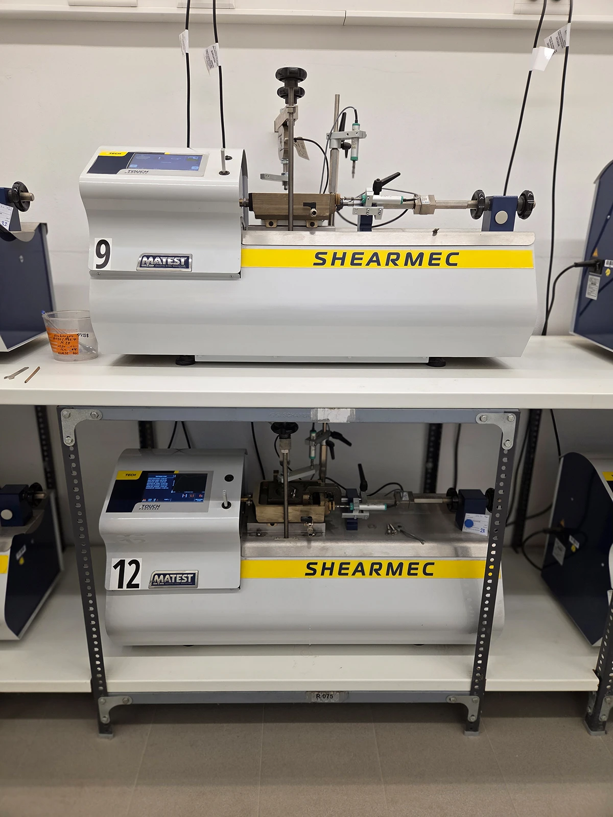 In unserem Labor in Witten führen wir eine breite Palette boden- und felsmechanischer Versuche durch: von A wie Atterberg bis Z wie Zugprüfungen an Felsproben. Zu unseren Standards gehört dabei auch die Durchführung von Scherversuchen nach DIN EN ISO 17892-10. Hier können wir uns auf nunmehr 13 Schergeräte unterschiedlicher Generationen verlassen. Von einem – bereits lange nicht mehr in Benutzung befindlichen – handbetriebenen Schergerät von 1965 bis hin zu modernen Geräten, die die erforderlichen Spannungen elektromechanisch erzeugen und somit ein Auflegen von teils schweren Gewichtsscheiben obsolet machen. Das schont nicht nur den Rücken unserer Mitarbeitenden, es gibt uns darüber hinaus die Möglichkeit zur platzsparenden Anordnung.