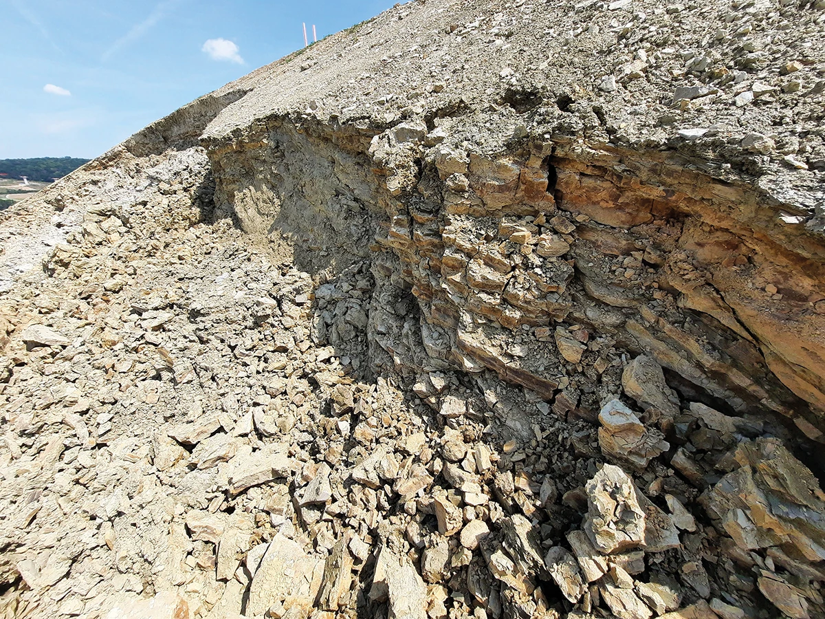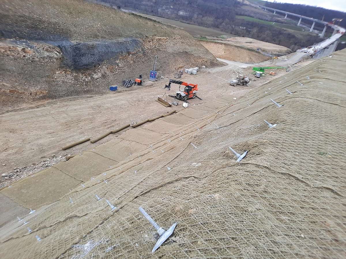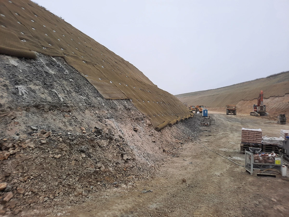 Die Ortsumgehung Bad Kösen (B 87) ist mit ca. 13,25 km Länge, 5 Knotenpunkten und 7 Brückenbauwerken eines der großen Straßen-Neubauprojekte der Landesstraßenbaubehörde Sachsen-Anhalt. Nach ersten Baugrunderkundungen bereits 2003 und Nacherkundungen infolge Trassierungsanpassungen und für Anschlussbereiche, Bahnquerungen etc., wurde im Frühjahr 2021 mit dem Bau der Ortsumgehung begonnen. Wir dürfen mit unserer Niederlassung Naumburg bzw. unserer RAP Stra-Prüfstelle in Naumburg diese Maßnahme, nach der Erkundung, nun auch bei der Umsetzung geotechnisch als Hauptgutachter begleiten. Kernstücke des Projekts sind imposante Talbrücken über das Saaletal (Länge 1,2 km, Höhe bis 60 m) und der anschließende, bis 40 m tiefe Einschnitt „Wachthügel“. Hier wurden ca. 1.000.000 m³ Material (im Wesentlichen Kalkstein) ausgehoben und in einer nahegelegenen Kiesgrube zur Rekultivierung genutzt. Zahlreiche Dumper waren über Monate damit beschäftigt das gelöste Gestein abzutransportieren. Für den Einschnitt war eine Sicherung durch Übernetzung mit hochfestem Stahldrahtgeflecht und Verankerungslängen von 3,5 bis 5,5 m geplant. Nachdem sich im Zuge des Aushubs als Folge von Schichtwässern und ungünstigem Schichteinfallen im Kalkstein erste Rutschungen in relevanter Größenordnung ereigneten, wurde diese Planung geprüft und angepasst. In der Konsequenz haben wir die Pfahllängen angepasst (L = 1,5 m bis max. 15 m) und die Sicherung wurde auf der gesamten Ostböschung und als Erosionsschutz auch auf der Westböschung ausgeführt. Die hierzu im Zuge der Bauausführung mehrfach an stark variierende geologische und geometrische Gegebenheiten und Rutschungen anzupassenden Statiken sind ein gelungenes Beispiel für die reibungslose und schnelle Zusammenarbeit zwischen unseren Kompetenzcentern Planung - Statik und Felsbau und der Abteilung Geotechnik Naumburg. Auch die Zusammenarbeit zwischen allen Projektbeteiligten ist in diesem Projekt – trotz teils divergenter Sichtweisen auf auftretende Situationen – als stets äußerst konstruktiv und lösungsorientiert hervorzuheben. Die Sicherungsarbeiten konnten in diesem Jahr erfolgreich abgeschlossen werden. Dabei wurden allein auf der Ostböschung insgesamt ca. 5.200 Kleinverpresspfähle mit einer Gesamtlänge von ca. 79.600 lfm und knapp 36.000 m² Stahldrahtgeflecht zur statischen Sicherung installiert. Dazu kommen rund 600 Zusatzanker und Seilanker und 2.300 m Randseile.